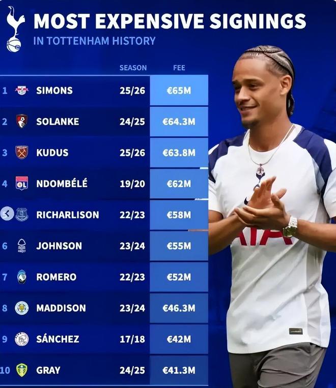 这是一件很可怕的事情,并且从穆里尼奥下课之后,就更加明显了。2025年热刺夏窗总支出是2.11亿欧元,有7名转入球员: