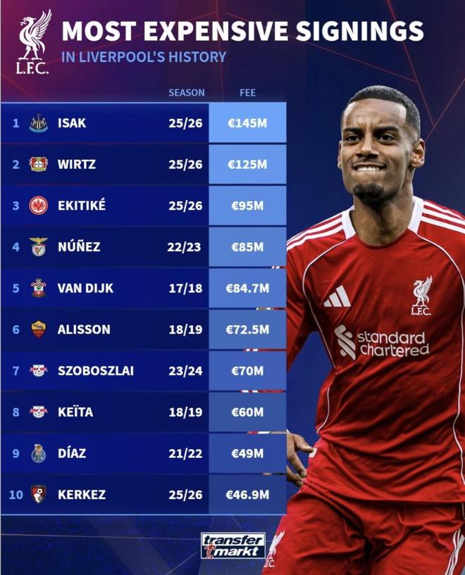 近日,知名足球数据网站 德国转会市场 公布了利物浦队史最贵引援榜(数据截至北京时间2025年9月2日)。榜单中既有范戴克、阿利松这样物超所值的经典操作,也有努涅斯、凯塔这种饱受质疑的高价签约,更有伊萨克、维尔茨等刷新纪录的新援。到底这些巨额投入是真正的“物有所值”,还是豪赌潜力的冒险?这份榜单给出了答案。
