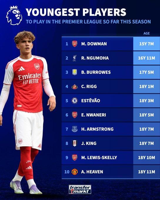 直播吧9月13日宣 德转列本赛季英超截止目前出场最年轻球员排行,道曼15岁7个月最年轻,恩古莫哈第二。