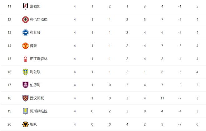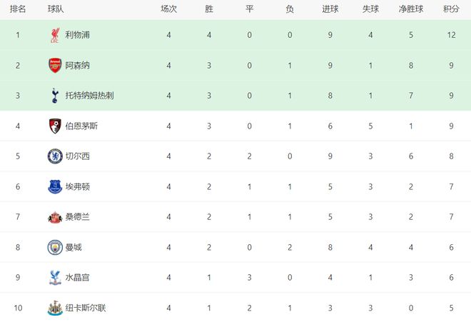 利物浦开局四连胜,积12分继续领跑积分榜,第二至第四的球队都是同积9分,阿森纳、热刺、伯恩茅斯同分,切尔西积8分位列第五,曼城积6分升至第八,曼联积4分跌至第十四。
