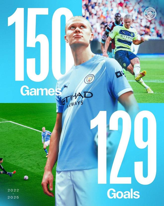 在与曼联的英超曼市德比中,哈兰德达成曼城生涯150场里程碑,一共打入129球。