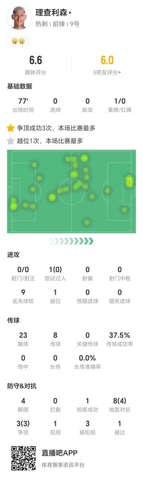 赛后技术统计数据显示,理查利森全场零射门,1次过人未能成功,4次解围,8次地面对抗成功4次,3次争顶全部成功,获评6.6分。