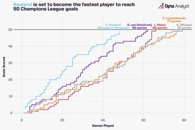该纪录目前由范尼斯特鲁伊保持,他用了62场达成欧冠50球。其他依次为梅西(66场)、莱万(77场)和姆巴佩(79场)。