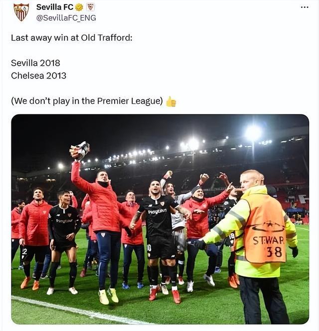 “老特拉福德最近一次客队胜利:塞维利亚2018年,切尔西2013年。”塞维利亚写道,“我们可不在英超踢球。”2018年欧冠1/8决赛,塞维利亚曾在梦剧场2-1击败曼联,将红魔淘汰出局。