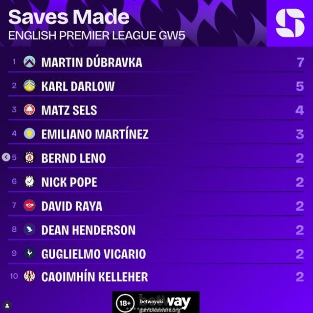 直播吧9月24日宣 英超第5轮战罢,squawkafootball列各项数据排行,伯恩利门将杜布拉夫卡是本轮扑救次数最多的门将,共有7次。