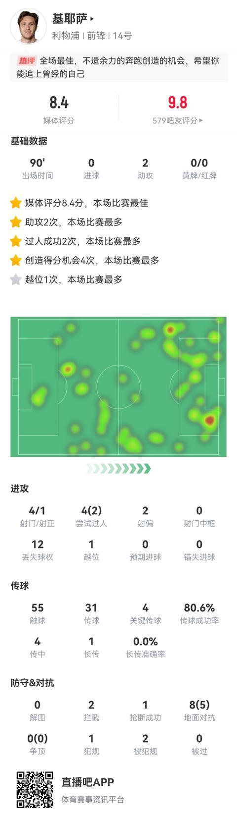 直播吧09月24日宣 在今天凌晨的联赛杯比赛中,小基耶萨首发打满全场送出2次助攻,帮助利物浦2-1战胜南安普顿。