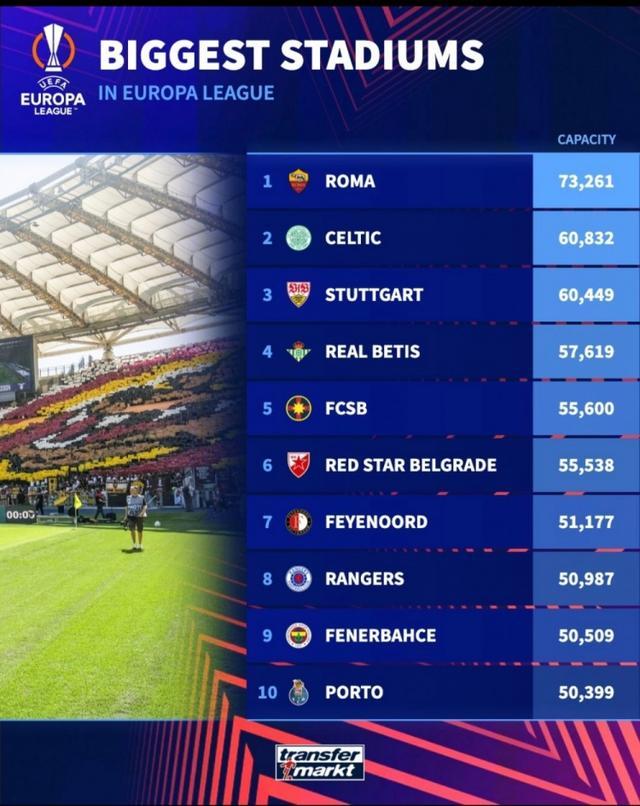 直播吧9月24日宣 德转盘点了本赛季欧联杯参赛球队主场最大可上座人数榜单,其中罗马主场居首,具体榜单如下: