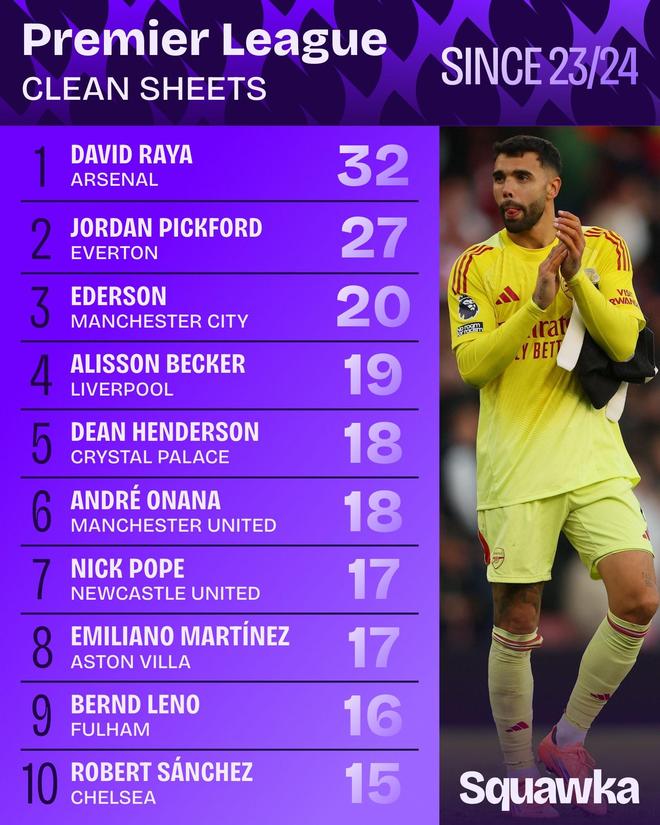 北京时间9月24日,来自Squawka的统计指出,自戴维-拉亚2023年夏天加盟阿森纳以来,这位西班牙国门在英超的零封场次排在所有门将的第一位。