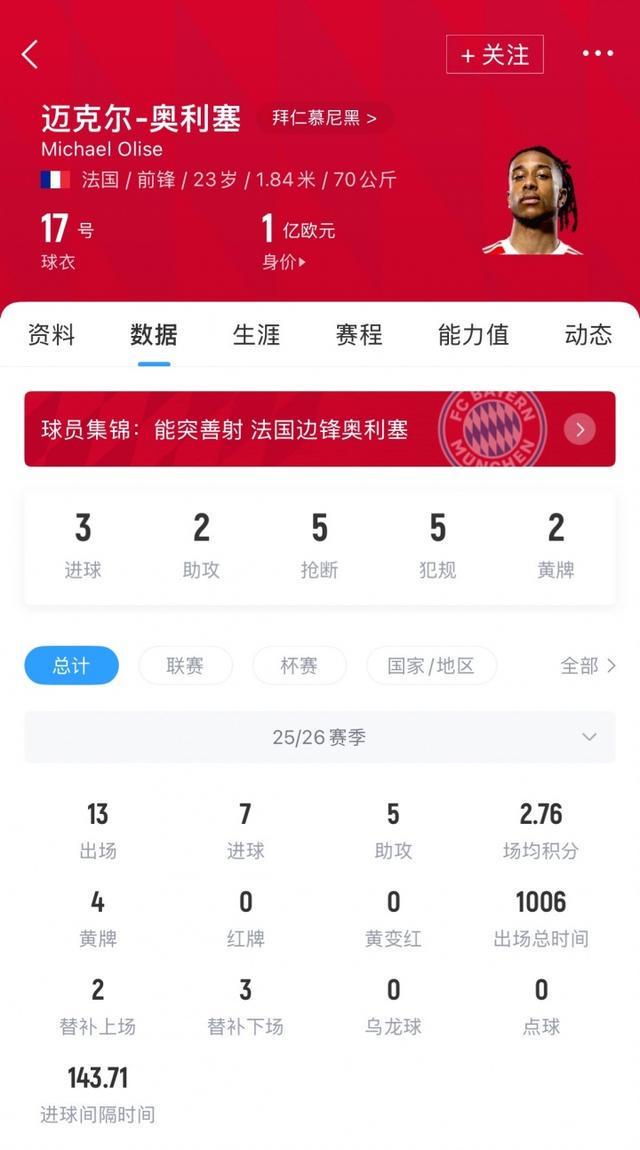 奥利塞现年23岁。法国前锋,本赛季代表拜仁各赛事出场13次,贡献7球5助,目前德转身价1亿欧元。