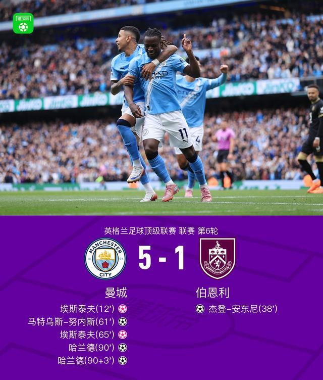 北京时间9月27日英格兰足球顶级联赛 联赛 第6轮,曼城主场对阵伯恩利。上半场多库一条龙后射门被扑,埃斯泰夫自摆乌龙,之后哈特曼传中,杰登-安东尼折射破门扳平。下半场哈兰德头球摆渡,努内斯抽射破门再度领先,之后努内斯传球,埃斯泰夫再度自摆乌龙,比赛尾声多库助攻哈兰德破门,补时阶段埃斯泰夫乌龙助攻,哈兰德单刀破门完成双响。最终曼城5-1战胜伯恩利。