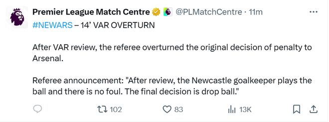“经回看,纽卡斯尔的守门员触碰到了皮球,不存在犯规行为。最终判罚为坠球。”