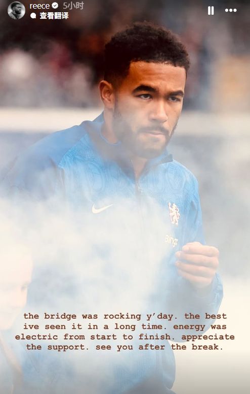 里斯·詹姆斯晒出自己身穿切尔西球衣照,并且配文:“蓝桥昨天的比赛助威声山呼海啸,我已经很长时间没有看到这么好的氛围了,全场(球迷)都保持了能量和激情,感谢你们的支持,国际比赛日后见。”