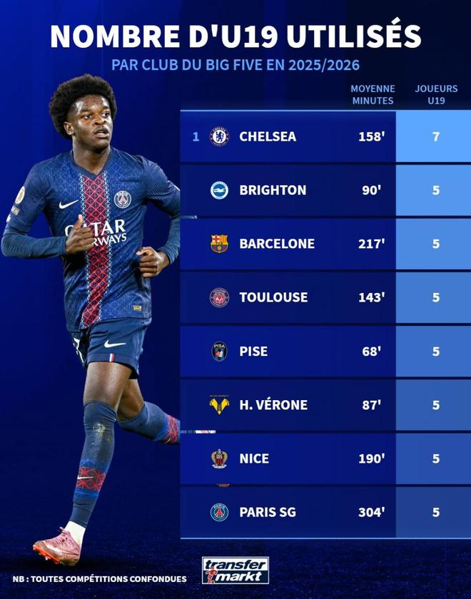根据德转的统计,巴黎圣日耳曼的主帅路易斯-恩里克本赛季至今一共使用过5名U19球员,合计出场时间为304分钟,而切尔西的主帅马雷斯卡则使用了7名U19球员,合计出场时间158分钟。巴塞罗那同样榜上有名,弗里克给了5名U19球员共计217分钟的出场时间。