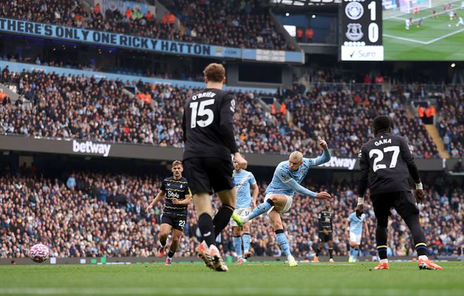 迟迟未能进球,挺身而出的还是哈兰德;第58分钟,福登左路直塞打穿埃弗顿防线,奥赖利快速跟进前插下底传中,包抄到位的哈兰德门前旱地拔葱顶出强力头球入网,1:0!这是哈兰德赛季第10粒英超进球,这是英超史上第3次有球员赛季前8场进球上双,而且这3次均由哈兰德完成。