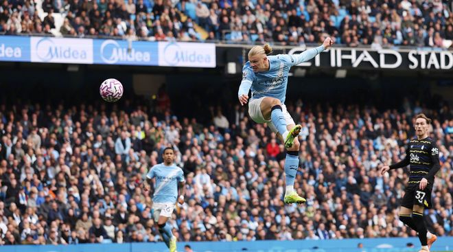 第63分钟,福登长传转移,萨维尼奥左侧禁区倒三角停球回敲,哈兰德迎球劲射,皮球穿裆塔尔科夫斯基命中远角,2:0!哈兰德5分钟时间梅开二度;同时他还在俱乐部和国家队已连续11场取得进球。此外哈兰德英超生涯105次出场已打入96球,这使得他在英超历史射手榜上超越范尼,升至第37位,在他身前的是打入98球的阿德巴约。