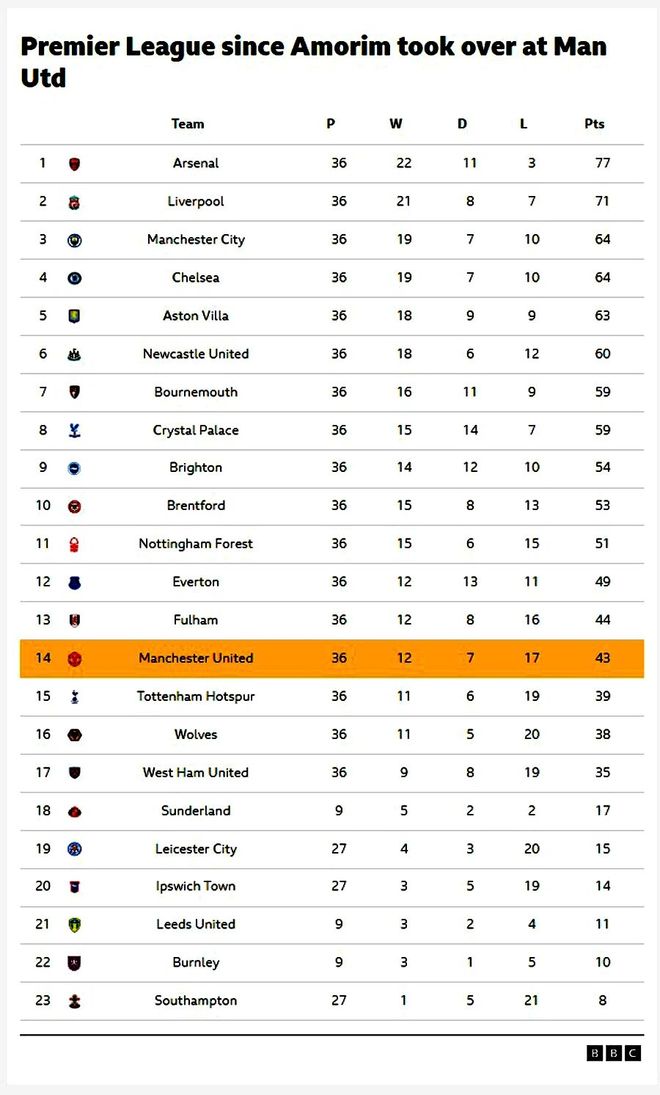 在曼联的一年之间,阿莫林输掉了52场比赛中的19场,他在场边有时候显得颇为消极,颓然地蹲着,或者仰头望天。