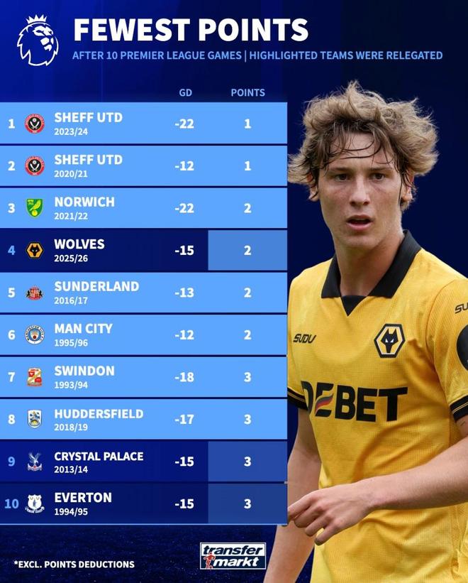 北京时间11月3日,来自德转的统计指出,狼队本赛季英超前10轮过后仅积2分,净胜球-15的成绩为英超历史联赛同期第三差的成绩。在这份榜单中,除狼队以外,排名前八的球队当赛季都最终降级。