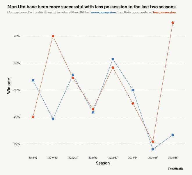 这一趋势可以追溯到本赛季之前,甚至在阿莫林于2024年11月开始执教老特拉福德之前。在曼联近年来的历史中,已有多个赛季显示,当球队在比赛中没有占据控球主导权时,他们在英超联赛中反而取得了更多的成功。