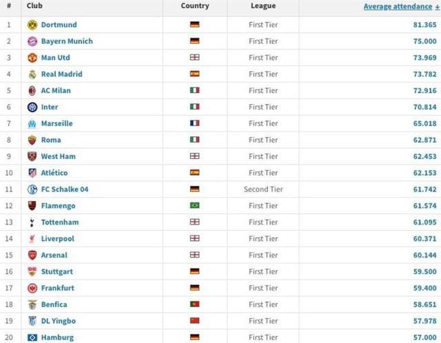 此外,中国足球也再次证明了我们的观赛热情,除了大连英博之外,北京国安也有场均45422名观众,亚洲第二,世界第41位,甚至比英超豪门曼城还场均多近2千人。而成都蓉城则以场均40820人排进亚洲前三,世界第52位,正好比切尔西高1位。(老邱)