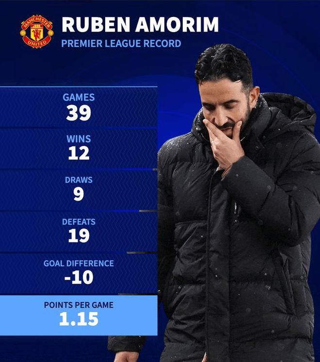 本场输球后,过去这一年里,阿莫林带队出战联赛39场,仅取得12胜9平19负,胜率仅为3成,输球率却接近5成。场均拿分只有1.15分,净胜球为-10,各项关键指标都难言理想。