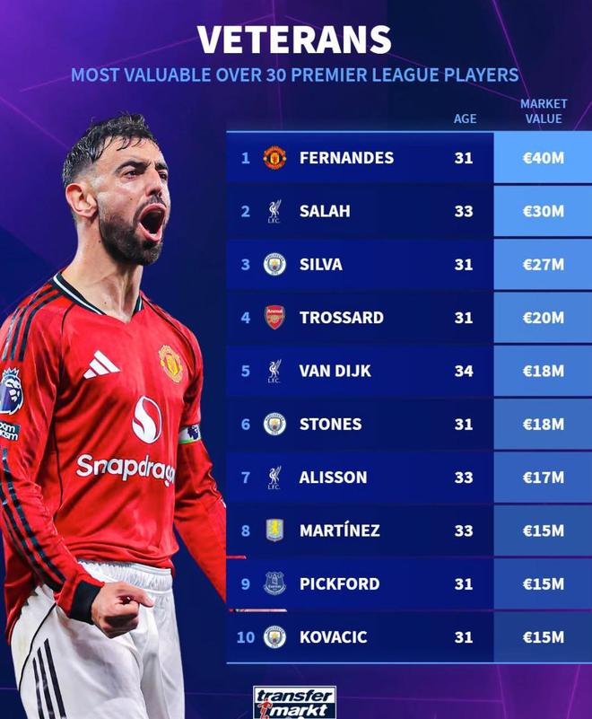 北京时间12月14日,在更新了英超球员的身价之后,德转还列出了英超30岁以上球员的身价榜,布鲁诺-费尔南德斯以4000万欧元的身价排名第一,萨拉赫3000万欧元排名第二,伯纳多-席尔瓦2700万欧元排名第三。