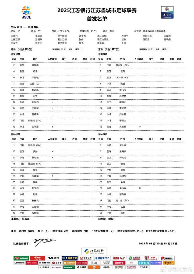 雷速体育8月30日宣 北京时间今日,“苏超”联赛第10轮,泰州队对阵常州队,赛前双方公布首发,中超河南队球员黄紫昌代表常州队出战。