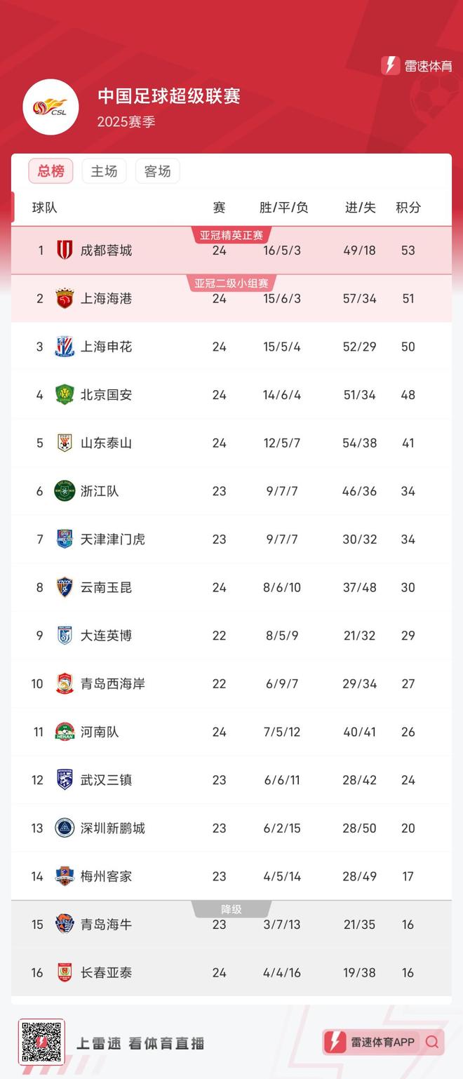 最新积分榜,蓉城53分、海港51分第二,申花50分第三,国安两连败后仍积48分。