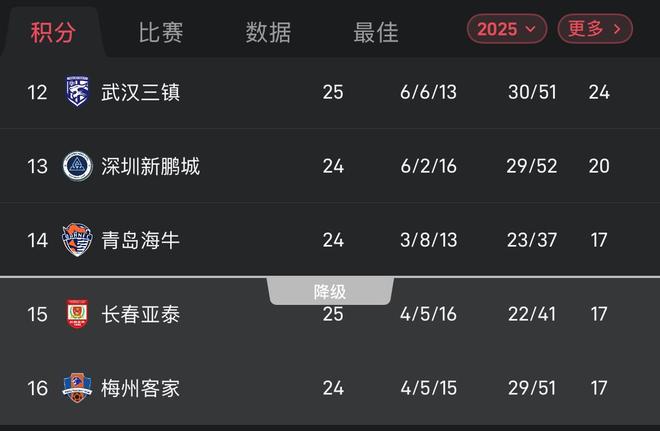 雷速体育9月20日宣 中超第25轮比赛战罢,目前保级区的三支中超球队海牛、亚泰、梅州均同为17分。