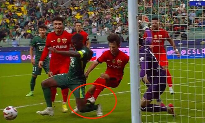 慢镜头显示,法比奥被王燊超从身后蹬踹了小腿。法比奥痛苦地倒在禁区里,但裁判没给出表示,比赛继续进行。国安队员不满主裁的判罚,双方球员在边线附近发生大面积的冲突。