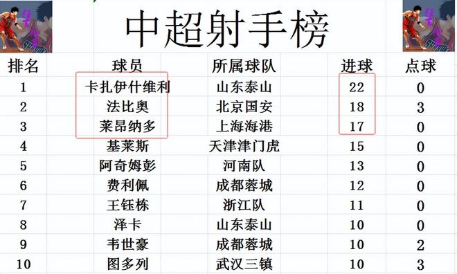 射手榜方面,卡扎伊什维利22球领跑,法比奥昨晚打入一球,18球位列第2,莱昂纳多上演帽子戏法,17球超过基莱斯升至第3。韦世豪,泽卡,图多列10球刚好挤入前十。