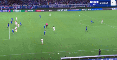 本场比赛补时8分钟,第98分钟50秒,成都蓉城中线处超远距离过顶长传发起最后一次进攻,费利佩点球点左侧高高跃起抢点头球摆渡往门前顶,皮球击地弹到小禁区右侧前沿,无人防守的罗慕洛超近距离打门竟然稍稍偏了,BOOM的一声皮球被门柱挡出,唐创抢到第2落点凌空往门前一扫,周定洋门线前接力转身将球扫入网窝,成都蓉城1:1压哨绝平上海申花。