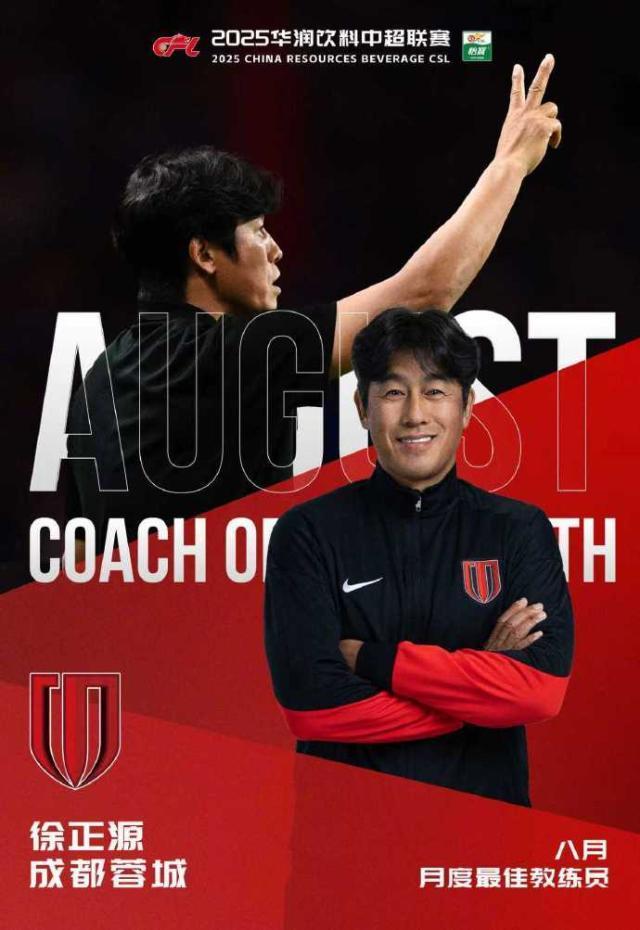 9月25日,中超联赛官方公布了8月最佳教练,成都蓉城主教练徐正源当选。