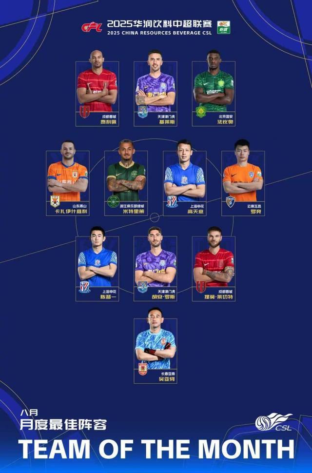 直播吧9月26日宣 中超官方公布8月最佳阵容,费利佩、瓦科在列,陈晋一、高天意、罗竞、吴亚轲入围,蓉城、申花、津门虎各有2位球员。