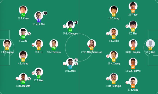 前卫:17-高天意(67'43-杨皓宇)、10-特谢拉(F)、34-刘诚宇(67'33-汪海健)