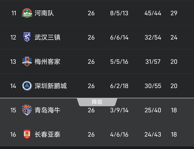 目前梅州客家和深圳新鹏城同积20分,梅州凭借胜负关系优势力压新鹏城升至第13。长春亚泰和青岛海牛同积18分,亚泰因胜负关系劣势暂时垫底。