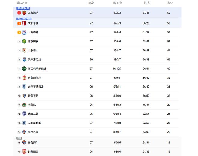 北京时间10月18日晚,中超第27轮比赛结束3场角逐!客场作战的山东泰山队2-2战平浙江队,无欲无求的津门虎0-2不敌云南玉昆队;而北京国安队则爆出大冷门,他们1-2输给深圳新鹏城。这3场赛事结束后,中超积分榜的争冠和保级形势基本上明朗了:3队成降级热门,1队退出争冠!