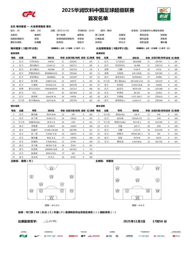 11月1日19:35,在2025赛季中超联赛第29轮,也就是倒数第2轮的一场关键争夺中,梅州客家坐镇主场五华奥体中心惠堂体育场,迎战大连英博海发。赛前,两队首发名单公布。