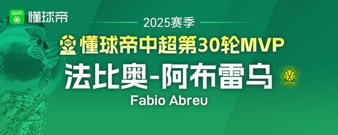 大家好,欢迎来到懂球帝2025赛季中超MVP评选现场。中超第30轮MVP得主出炉,北京国安前锋法比奥在末轮的金靴大战中,用一次大四喜帮助自己笑到最后,也帮助他以68%得票率的大幅领先优势,当选本轮中超的MVP。这是法比奥本赛季第三次当选中超MVP,并列最多。