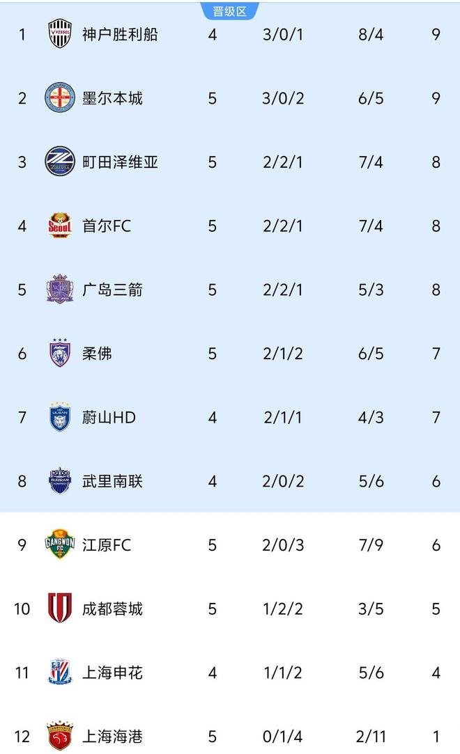 北京时间11月25日,亚冠精英联赛联赛阶段东亚区第5轮首个比赛日4场比赛顺利进行。最新积分榜方面,率先出战的2支中超球队1平1负无缘前8,刚夺得中超三连冠的上海海港仅积1分垫底,前8仅有3分之差。