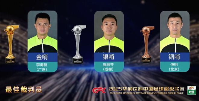 中超联赛:金哨 李海新(广东)、银哨 唐顺齐(成都)、铜哨 傅明(北京)